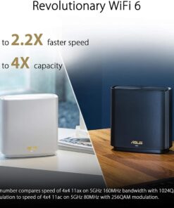 Asus Tri band home Mesh ZENwifi system, XT8, black; 1.5 GHz quad- core processor, 256 MB Flash, 512 MB RAM ; Network Standard: IEEE: IEEE 802.11a, IEEE 802.11b, IEEE 802.11g, IEEE 802.11n, IEEE 802.11ac, IEEE 802.11ax, IPv4, IPv6; Antenna: 6x internal antennas; Transmit/Receive: 2.4 GHz 2 x 2, 5 GHz-1 2 x 2, 5 GHz-2 4 x 4,Operating Frequency: 2.4G Hz, 5 GHz-1, 5 GHz-2; Ports: RJ45 for 2.5G BaseT for WAN x 1, RJ45 for Gigabits BaseT for LAN x 3 USB 3.1 Gen 1 x 1; Power Supply: AC Input : 110V~240V(50~60Hz) DC Output : 19 V with max. 1.75 A current, 160 x 75 x 161.5 mm, 716g.